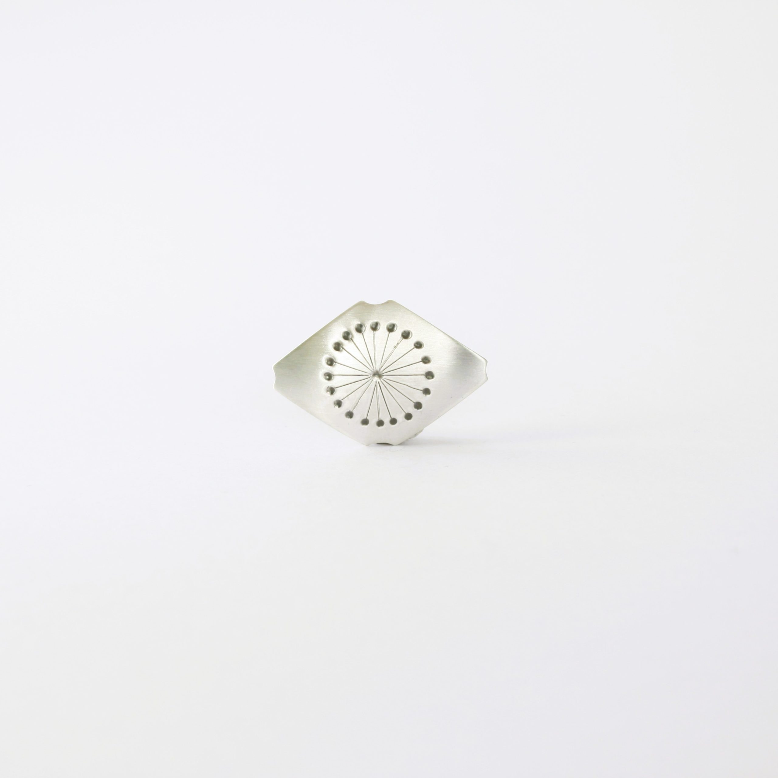 Zilveren speld in ruit-vorm. De maat van de speld is 25mmx37mm.
