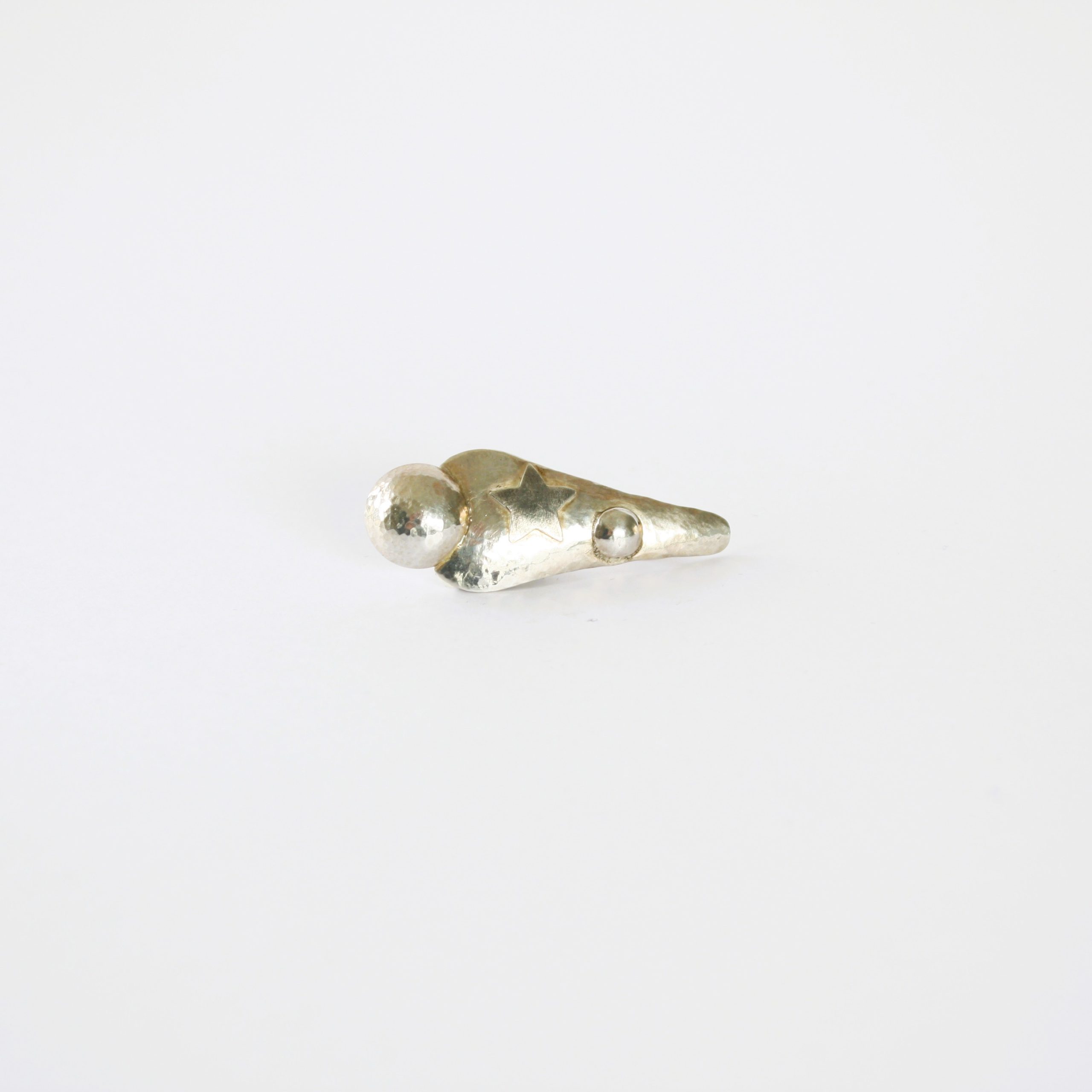 Zilveren speld met bollen en ster. De maat van de speld is 25mmx53mm.