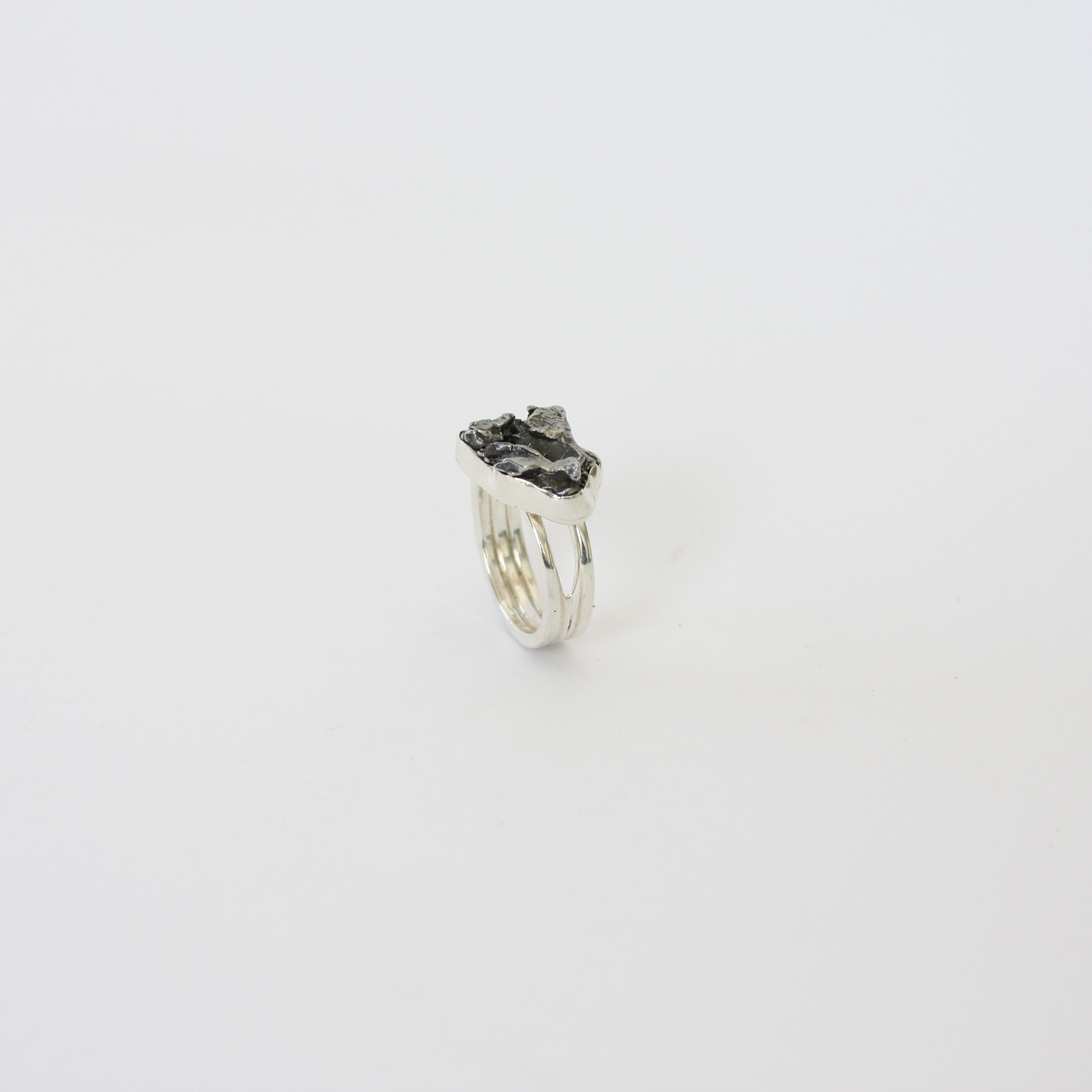 Zilveren deels opengewerkte ring met meteoriet. Ringmaat 62.